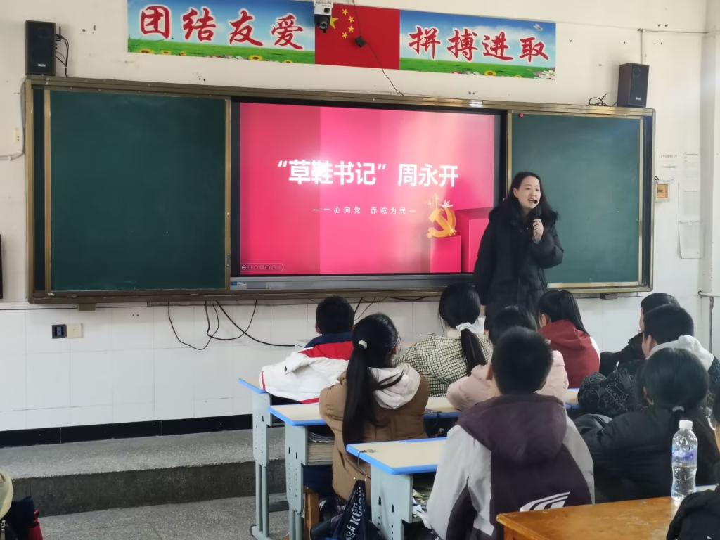 在此期间,马克思主义学院还组织师生开展了“乡村学校少年宫”志愿服务活动。丁玉洁老师以周永开同志的先进事迹为蓝本,为初中学生讲授了一堂生动的红色思政微课。丁老师通过珍贵的资料、感人的故事生动阐释了周永开同志坚守信仰、对党忠诚、无私奉献的崇高精神,引领学生从优秀共产党员的先进事迹中汲取精神养分,厚植爱党爱国情怀。马克思主义学院思想政治教育专业学生代表卓彩云向初中学生讲述了红色故事。她们以饱满的情感、生动的讲述,让红色基因在娓娓道来中浸润学生心灵,激发在场学生的民族自豪感与责任感,课堂互动热烈,氛围浓厚,引发了听课学生的情感共鸣。