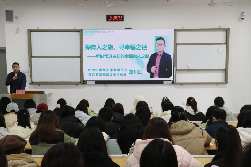 12月10日下午,马克思主义学院在莲湖东区A214教室开展第一期“大中小学思政课名师讲堂”活动,邀请巴中市优秀教育工作者、通江县瓦室初级中学校长龙川江作“探育人之旅,寻幸福之径——新时代班主任的幸福育人之路”专题讲座。学院副院长何先成主持,思想政治教研室主任曹红梅及2023级全体同学参与。