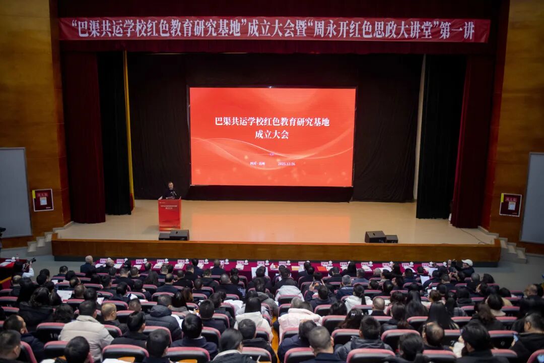 2025年12月26日上午,在纪念毛泽东同志诞辰132周年之际,四川文理学院艺术传媒大楼多功能厅庄重而热烈,“巴渠共运学校红色教育研究基地”成立大会暨“周永开红色思政大讲堂”第一讲在此隆重举行。本次活动由达州市委教育工委与四川文理学院联合主办,标志着川东北地区红色教育研究与实践迈向体系化、协同化、品牌化的新阶段。市级相关部门,巴中市、广安市委教育工委,原“巴渠共运友好学校联谊会”成员单位,大中小学思政课一体化共同体代表及师生代表等齐聚一堂,共襄红色教育盛举。
